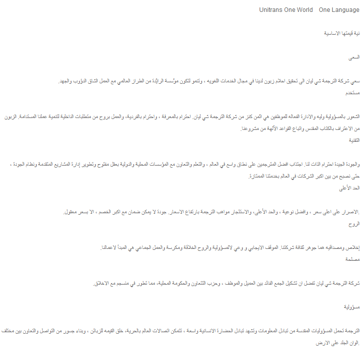 الشعور بالمسؤولية وليه والادارة الفعاله للموظفين هي اثمن كنز من شركة الترجمة شي ليان. احترام بالمعرفة ، واحترام بالفردية، والعمل بروح من متطلبات الداخلية لتنمية عملنا المستدامة. الزبون من الاعتراف بالكتاب المقدس واتباع القواعد الآلهة من مشروعنا.التقنية