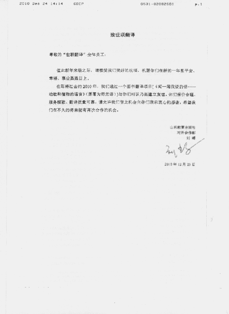 在即將過去的2010年,我們通過一個圖書翻譯項目【《聞一聞我說的話------動物和植物的語言》(原著為荷蘭語)】與你們相識乃至建立友誼,你們報價合理、服務細致、翻譯質量可靠。請允許我們借此機會向你們表示衷心的感謝,希望我們在不久的將來能有再次合作的機會。