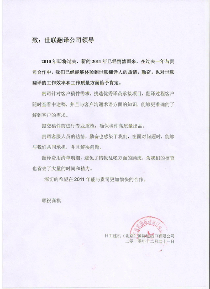 2010年即將過去,新的2011年已經悄然而來,在過去一年與貴公司合作中,我們已經能夠體驗到世聯翻譯人的熱情,勤奮。也對世聯翻譯的工作質量方面給予肯定。