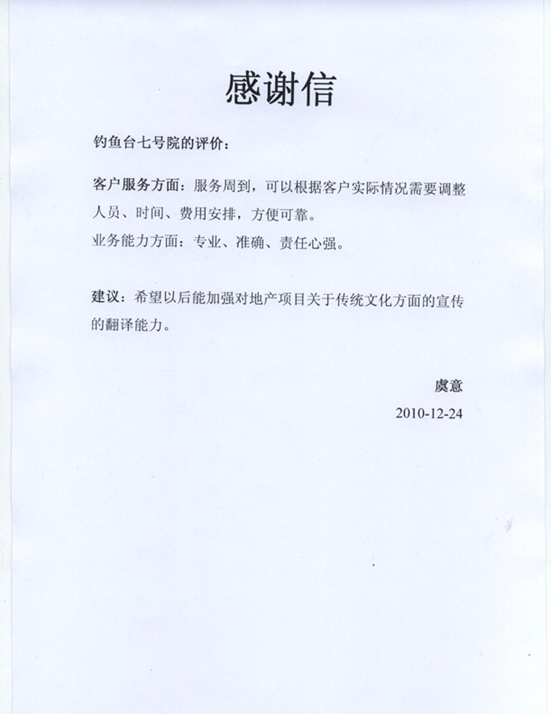 建議:希望以后能加強對地產項目關于傳統文化方面的宣傳的翻譯能力。 虞意 2010-12-24