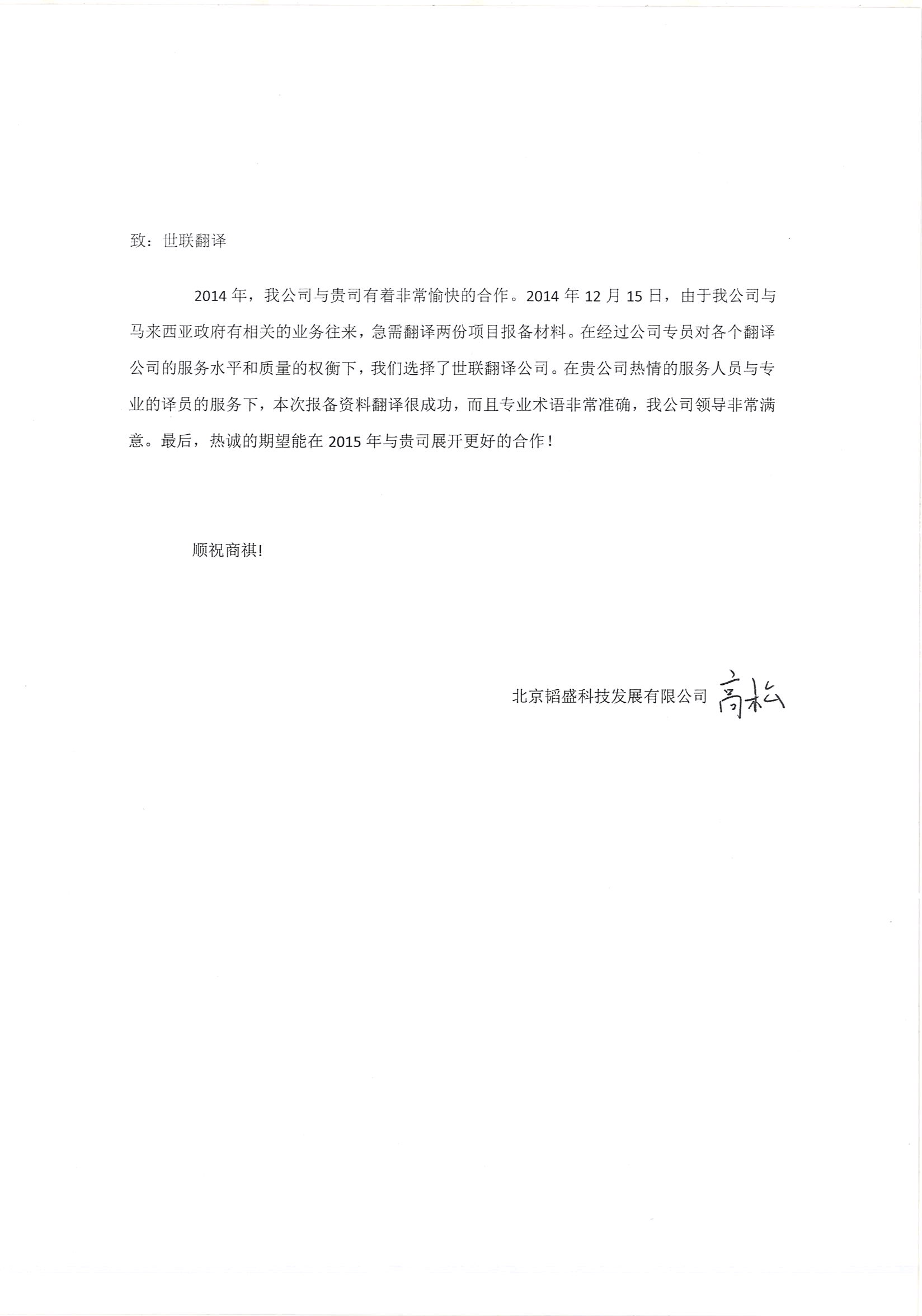 “在與世聯(lián)翻譯合作期間,世聯(lián)秉承著“上善若水、厚德載物”的文化理念,以上乘的品質(zhì)和質(zhì)量,信守對(duì)客戶的承諾,出色地完成了我公司交予的翻譯工作。”