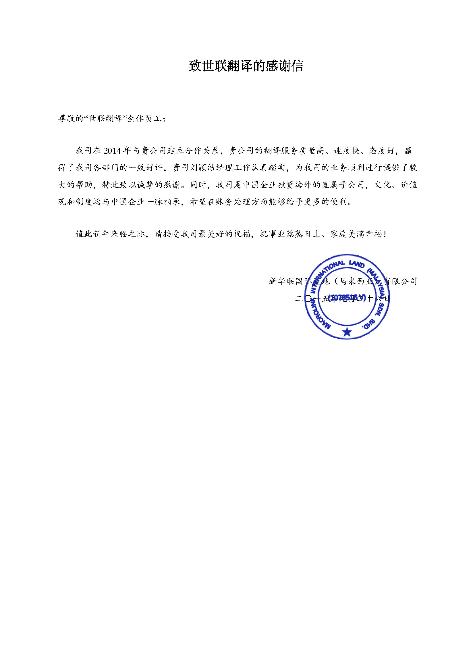 • “在與世聯翻譯合作期間,世聯秉承著“上善若水、厚德載物”的文化理念,以上乘的品質和質量,信守對客戶的承諾,出色地完成了我公司交予的翻譯工作。”