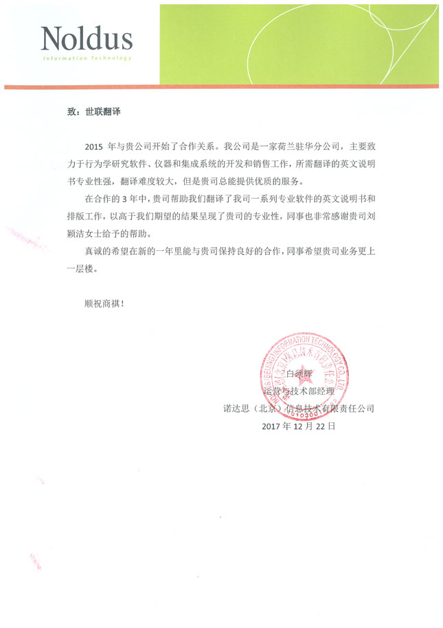 致:世聯翻譯2015 年與貴公 司開始 了合作關 系。我公司是一家荷蘭駐華分公司,主要致力于行為學研究軟件、儀器和集成系統的開發和銷售工作,所需翻譯的英文說明書專業性強,翻譯難度較大,但是貴司總能提供優質的服務。在合作的3年中,貴司幫助我們翻譯了我司一系列專業軟件的英文說明書和排版工作,以高于我們期望的結果呈現了貴司的專業性,同事也非常感謝貴司劉 穎潔女士給予的幫助。真誠的希望在新的一年里能與貴司保持良好的合作,同事希望貴司業務更上一層樓。順祝商祺!Unitrans世聯翻譯公司在您身邊,離您近的翻譯公司,心貼心的專業服務,專業的全球語言翻譯與信息解決方案供應商,專業翻譯機構品牌。無論在本地,國內還是海外,我們的專業、星級體貼服務,為您的事業加速!世聯翻譯公司在北京、上海、深圳等國際交往城市設有翻譯基地,業務覆蓋全國城市。每天有近百萬字節的信息和貿易通過世聯走向全球!積累了大量政商用戶數據,翻譯人才庫數據,多語種語料庫大數據。世聯品牌和服務品質已得到政務防務和國際組織、跨國公司和大中型企業等近萬用戶的認可。 專業翻譯公司,北京翻譯公司,上海翻譯公司,英文翻譯,日文翻譯,韓語翻譯,翻譯公司排行榜,翻譯公司收費價格表,翻譯公司收費標準,翻譯公司北京,翻譯公司上海。