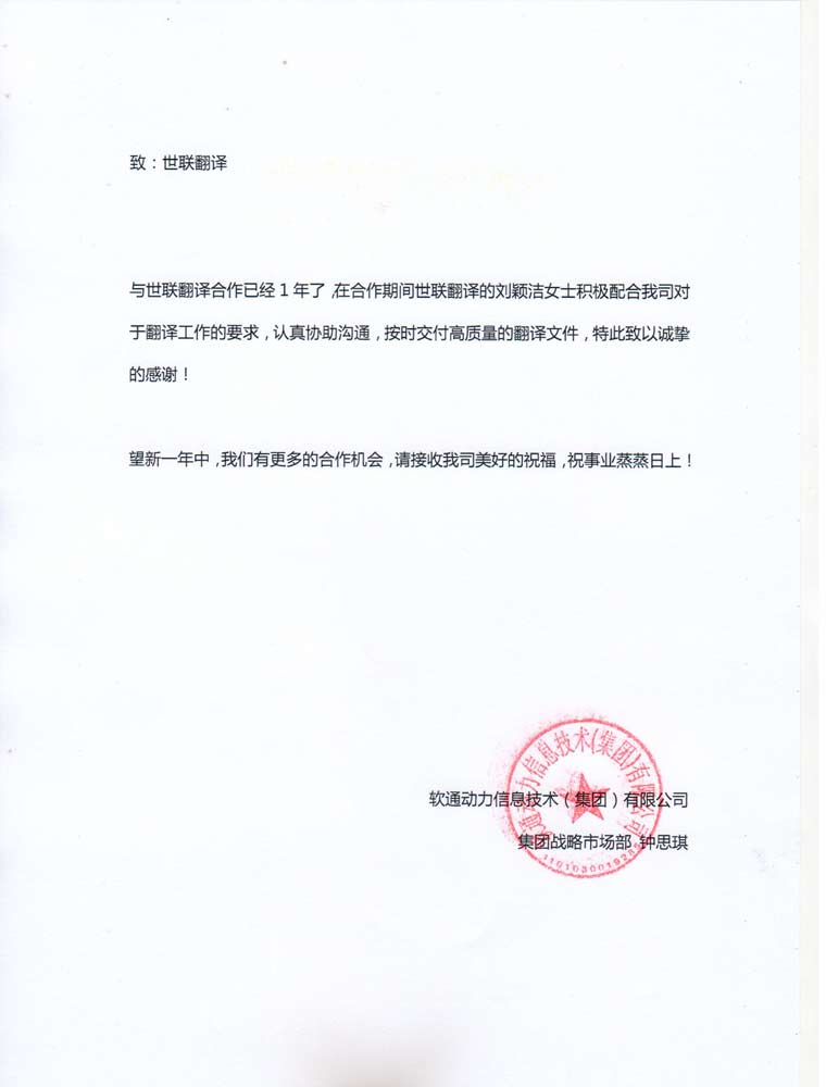 軟通動力信息技術(集團)有限公司致世聯翻譯的一封信