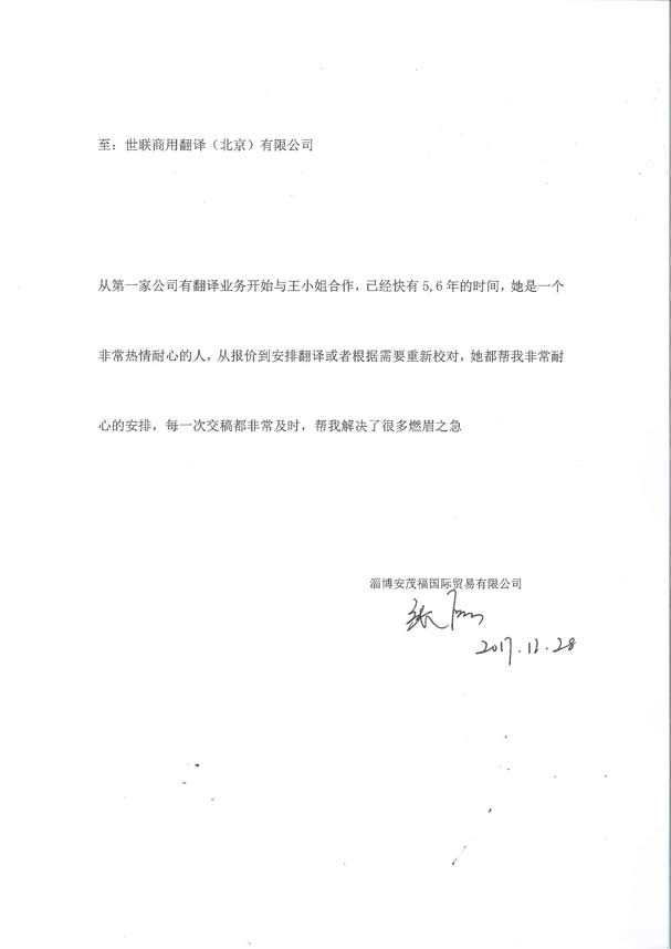 淄博安茂福國際貿(mào)易有限公司對世聯(lián)翻譯公司的評價(jià)