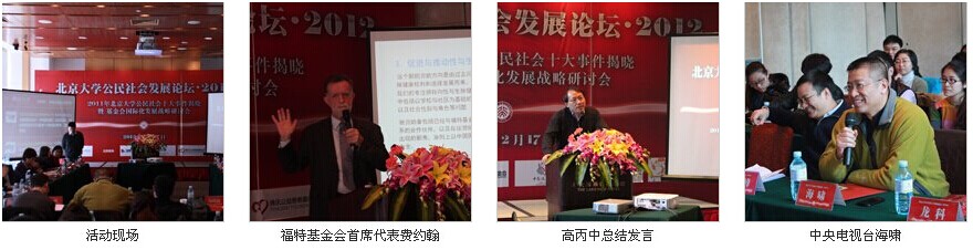 2012年2月17日,北京大學(xué)公民社會發(fā)展論壇在北大博雅國際會議中心舉行。清華大學(xué)公共管理學(xué)院教授、NGO研究所所長王名,北京大學(xué)國際關(guān)系學(xué)院副院長王逸舟教授,北京大學(xué)經(jīng)濟(jì)學(xué)院教授劉怡,中國青少年發(fā)展基金會副理事長顧曉今,中國扶貧基金會副秘書長劉文奎,南都公益基金會理事長徐永光,騰訊公益慈善基金會執(zhí)行秘書長竇瑞剛,陽光文化基金會副秘書長高廣深,《南方都市報》時評部副主任何雪峰,《新京報》首席評論員曹保印,上海廣播電視臺電視新聞中心評論部副主任施喆等來自學(xué)界、業(yè)界、媒體界的代表60多人參加了此次論壇。