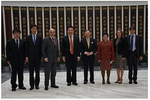 與會人員:人民大學重陽金融研究院執行副院長王文,國際商會中國國家委員會秘書長林舜杰,國際商會秘書長讓-蓋•卡里埃,中國人民大學校長、重陽金融研究院院長陳雨露(左四),國際商會主席、美國總統奧巴馬貿易政策與談判顧問委員會主席麥格勞三世(右四),前中國銀行副行長、國際商會執行理事、人大重陽高級研究員張燕玲(右三),國際商會政策與商業慣例部主管斯特凡諾•貝爾塔西(右一)。